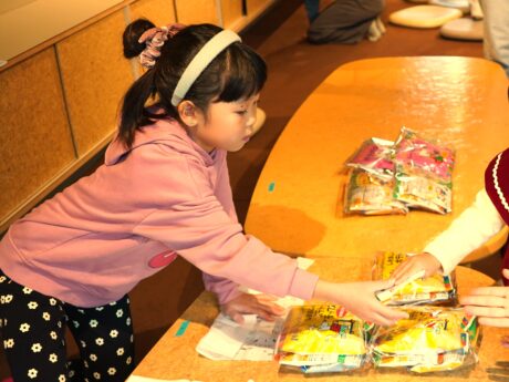 おやつ引換券を受け取り、おともだちの年齢に合わせてお菓子を渡すみゆちゃん。
